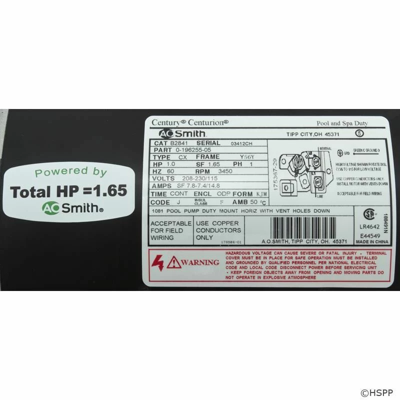 It is important to know that pool pump motors are not manufactured by the pump manufacturer; the motor will usually be manufactured by AO Smith, Magnetek or Centurion. Your pump’s motor should have a label or faceplate on it which includes the information you need to replace your pump motor. The most important categories to note will be the horsepower (hp), motor frame (fr), voltage and service factor (sf). Some labels will provide you with a model number and it will usually be listed as CR or CAT.