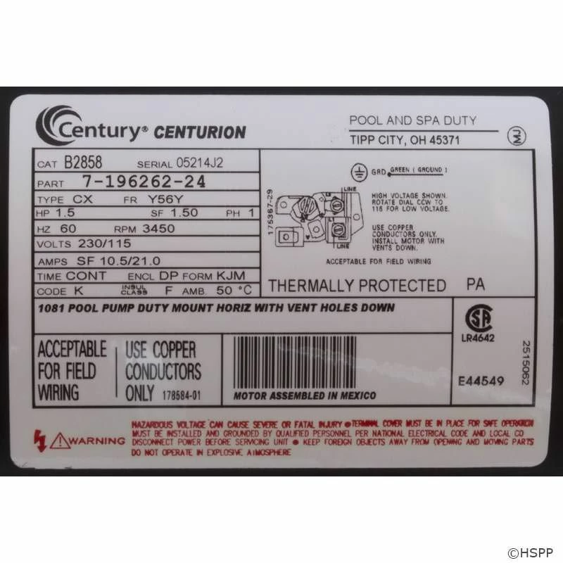 It is important to know that pool pump motors are not manufactured by the pump manufacturer; the motor will usually be manufactured by AO Smith, Magnetek or Centurion. Your pump’s motor should have a label or faceplate on it which includes the information you need to replace your pump motor. The most important categories to note will be the horsepower (hp), motor frame (fr), voltage and service factor (sf). Some labels will provide you with a model number and it will usually be listed as CR or CAT.