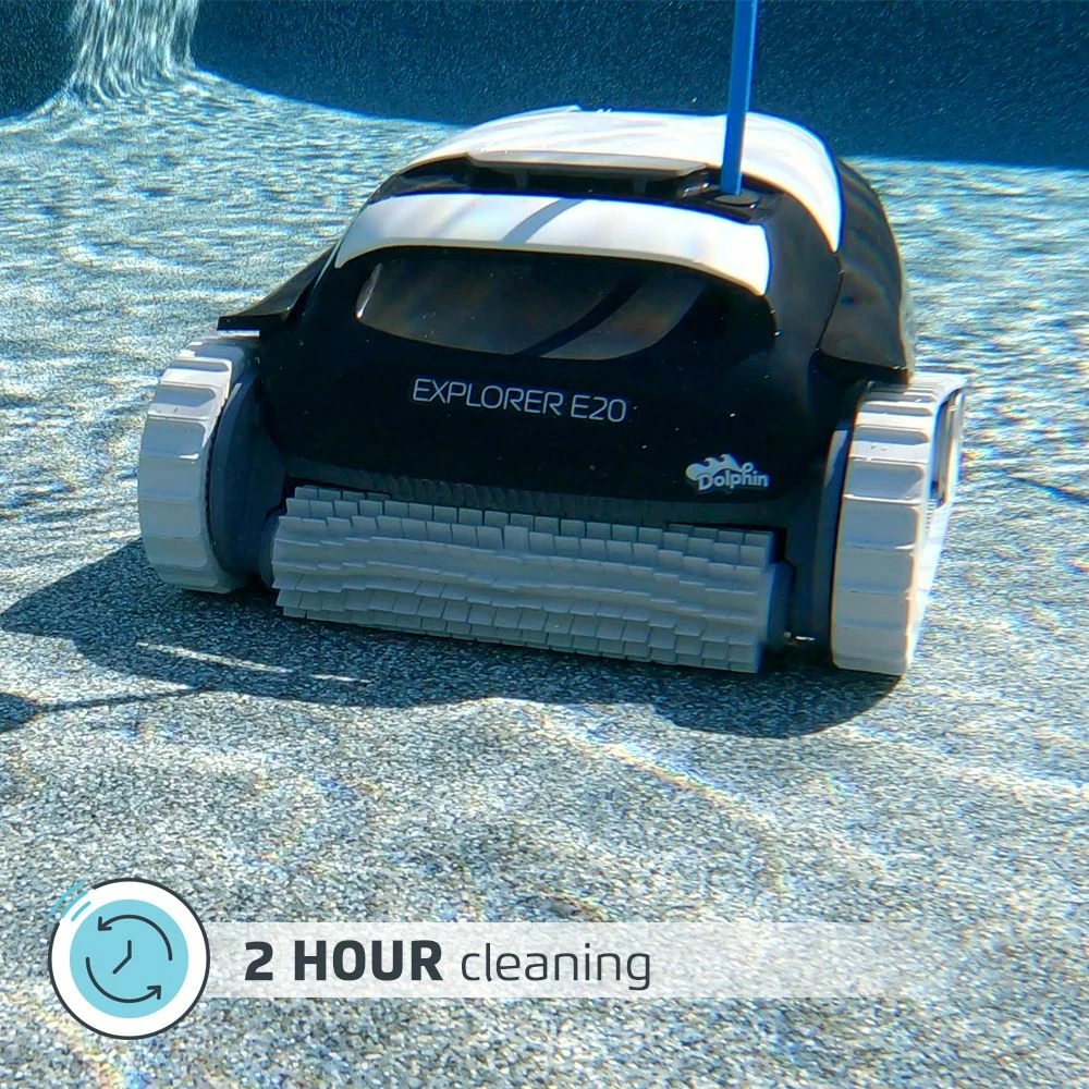 - Sit back and relax while the Dolphin Explorer E20 robotic pool vacuum cleans the pool for you. Ideal for in-ground swimming pools up to 33 feet, this easy to use, compact cleaner will have your pool ready for splashing fun in just 2 hours.