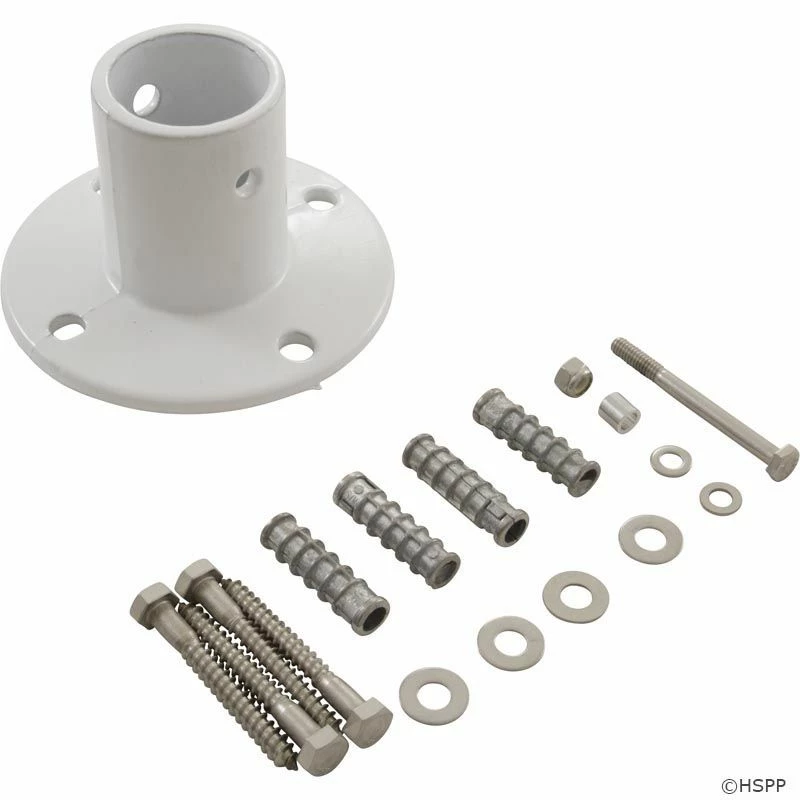 The Perma-Cast PF-3119-A White Aluminum Deck Flange with Hardware is a round flange that mounts to the pool deck to secure handrails or ladders with an outside diameter of 1.90 inches. This kit includes the anchors and bolts to attach flange to concrete. Sold individually.
