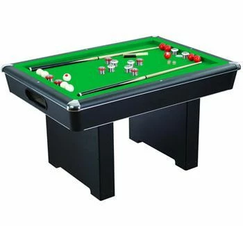 The Renegade slate bumper pool table offers outstanding durability and value. Comes with a genuine slate playing surface and tournament tested K-66 gum rubber cushions for solid and true table play. Other quality features include CARB certified MDF cabinet construction. No cheap particle board. Chrome plated corner castings with a carpeted ball return system which reduces noise and makes game setup quick and easy. Durable black cabinetry supported by pedestal style legs for stable game play. The table includes two 48 inch cues, 10 bumper pool balls, a table brush and chalk.