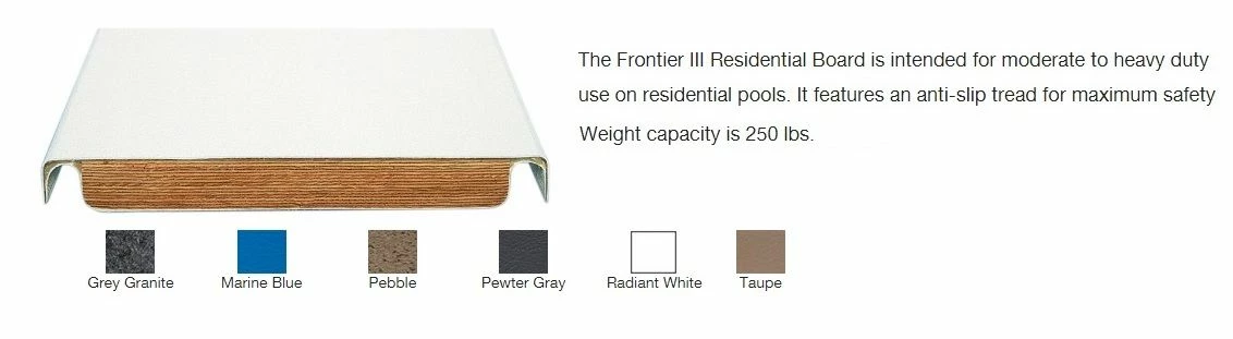 The Frontier III Residential Board is intended for moderate to heavy duty use on residential pools.