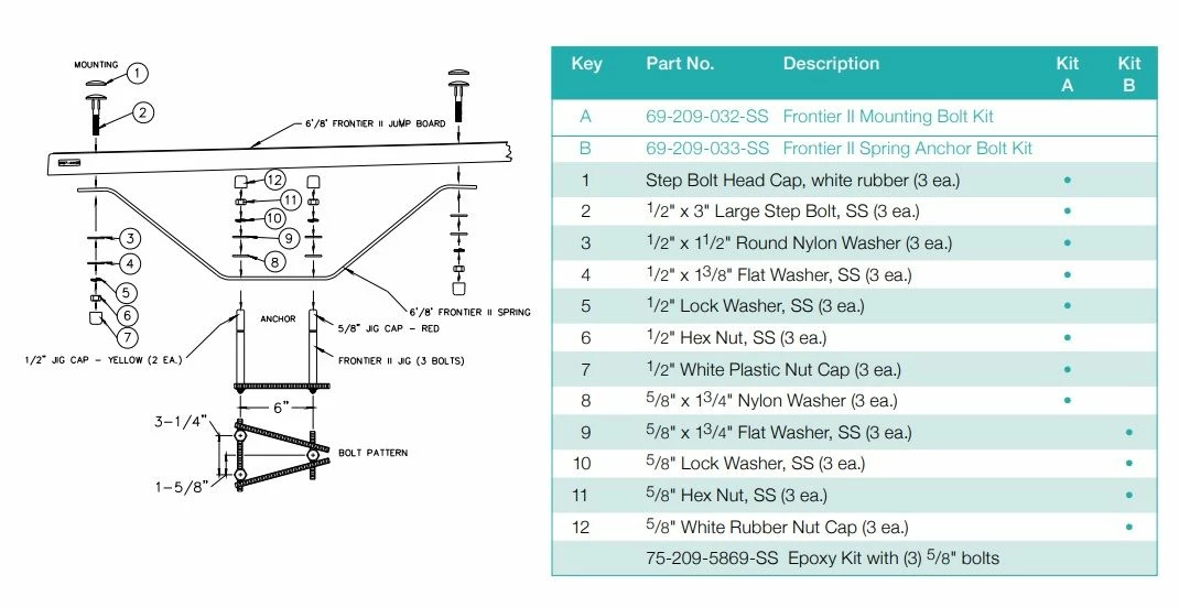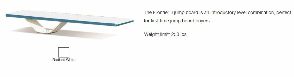 The Frontier II jump board is an introductory level combination, perfect for first time jump board buyers. The Frontier II Board is intended for light to moderate duty use on residential pools.