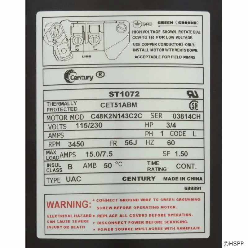 It is important to know that pool pump motors are not manufactured by the pump manufacturer; the motor will usually be manufactured by AO Smith, Magnetek or Centurion. Your pump’s motor should have a label or faceplate on it which includes the information you need to replace your pump motor. The most important categories to note will be the horsepower (hp), motor frame (fr), voltage and service factor (sf). Some labels will provide you with a model number and it will usually be listed as CR or CAT.
